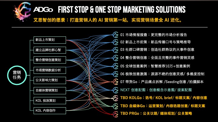 【艾思智创】 是一家专注于营销创新解决方案的领导者,成立于 2023 年 AGI 元年,由三位深耕广告公关营销、专业顾问咨询、以及 AI 产品开发的业内专家于上海设立,并以台北做为海外发展第一站。 不断探索AI在营销领域的无限可能,独家开发出’AI创新方法论’,分析AI关键创新场景,致力将AI技术与营销创意相结合,并于2024年推出革命性产品—— ADGo。